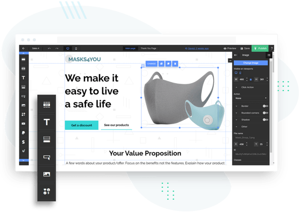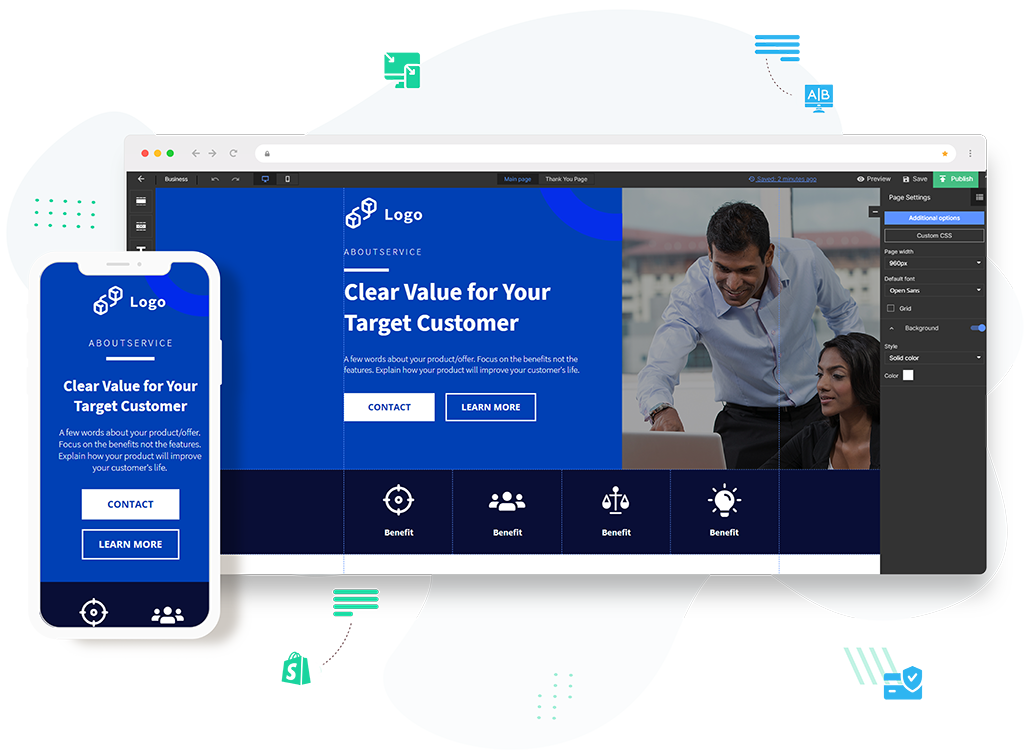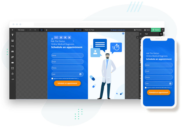 Pick a template and start customizing your landing page with our powerful drag and drop editor. You can even adjust the page to optimize for desktop, tablet, and mobile phone.